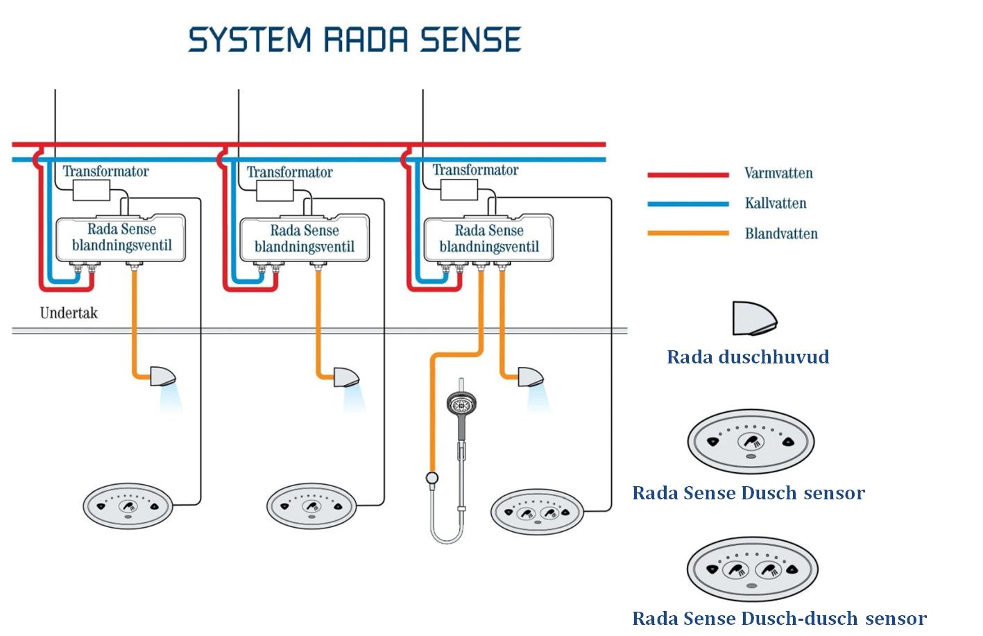 Rada Sense är en elektronisk blandningsventil för montage ovan undertak eller bakom vägg. Både flöde och temperatur kontrolleras med hjälp av en väggmonterad beröringsfri sensorpanel vilket ger en hög hygien. Med hjälp av Rada Sense appen kan man programmera bland annat flödestid, automatisk hygienspolning och hetvattenspolning. Rada Sense levereras komplett med blandningslåda, sensorpanel, transformator, backventiler samt filter. Komplettera endast installationen med lämpligt duschhuvud och ev. handdusch alternativt med utloppspip.